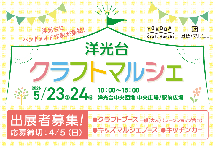 2026.5/23(土)・24(日)に開催する「洋光台クラフトマルシェ」の出展者を募集しています!クラフト作品の展示販売、ワークショップ、1ブース内で両方でも構いません。キッチンカーはもちろん、小学生以下のお子様のクラフト作家さんにご出展いただくための「キッズマルシェ」ブースもあります!皆様のご応募お待ちしております!