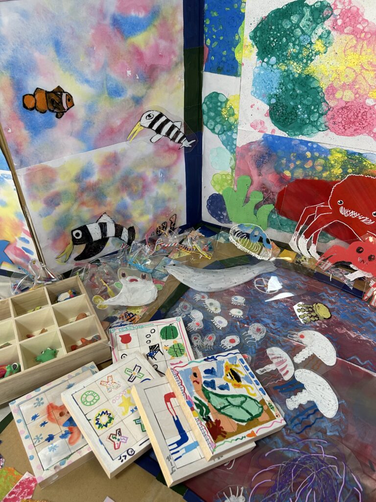みけねこ工房です。夏休みにみんなでえのすいに絵を描きに行ったときのスケッチをもとにして、大きなパネルに魚たちの絵を描きました。そのパネルを使ったゲームや景品、マグネット、レジン、ポストカード、クリスマスグッズなどを作っています。準備も当日も今日もがんばります!