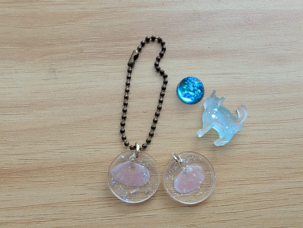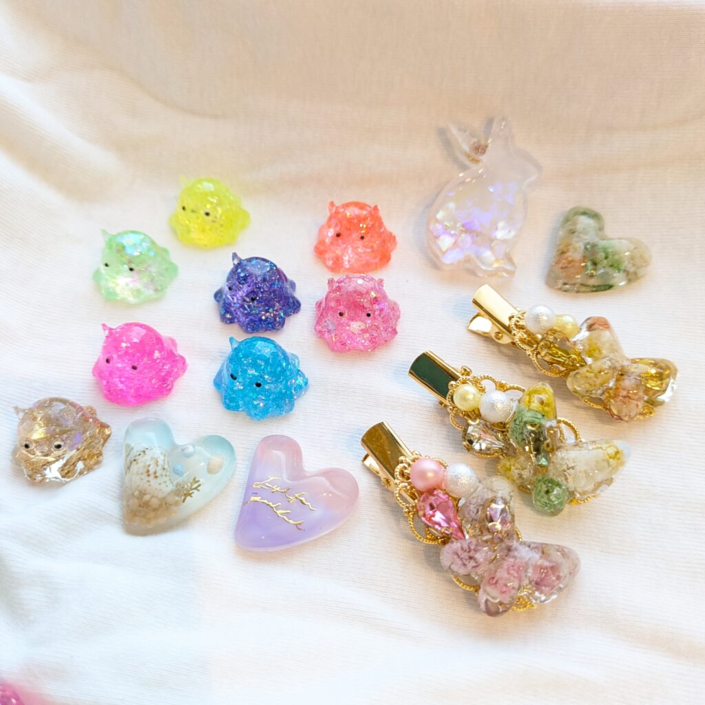 レジンでキーホルダー、ヘアゴム、ネックレスなどを作りました。大人気のメンダコちゃんも色鮮やかに仕上げました!ワークショップやゲームもできたらいいなと思っています。よろしくお願いします!