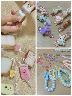 色とりどりのキラキラしたクラゲやお守りのキーホルダーや、デコホイップクリームを使ったヘアピン、ヘアゴムやネックレス、イヤリングにピアスなどがあり、他にもプリンや花などのマグネットもあります!3個以上お買い上げの人にはパワーストーン1個プレゼントします!(商品6個でパワーストーン2個)